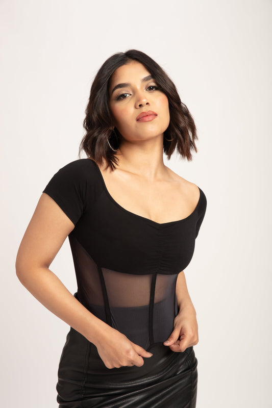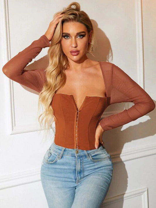 SAVE 47%Square Neck Corset Mesh Brown Top