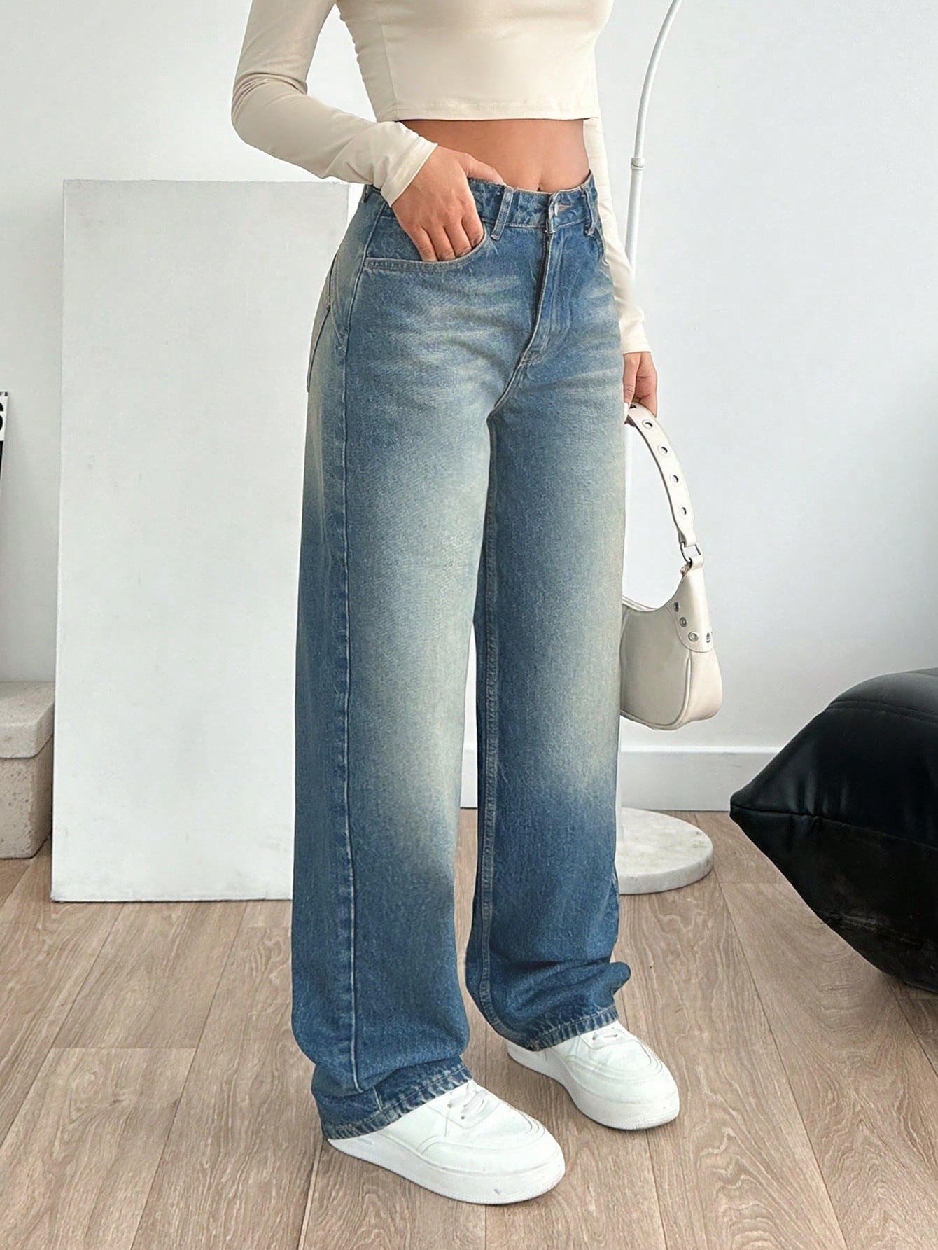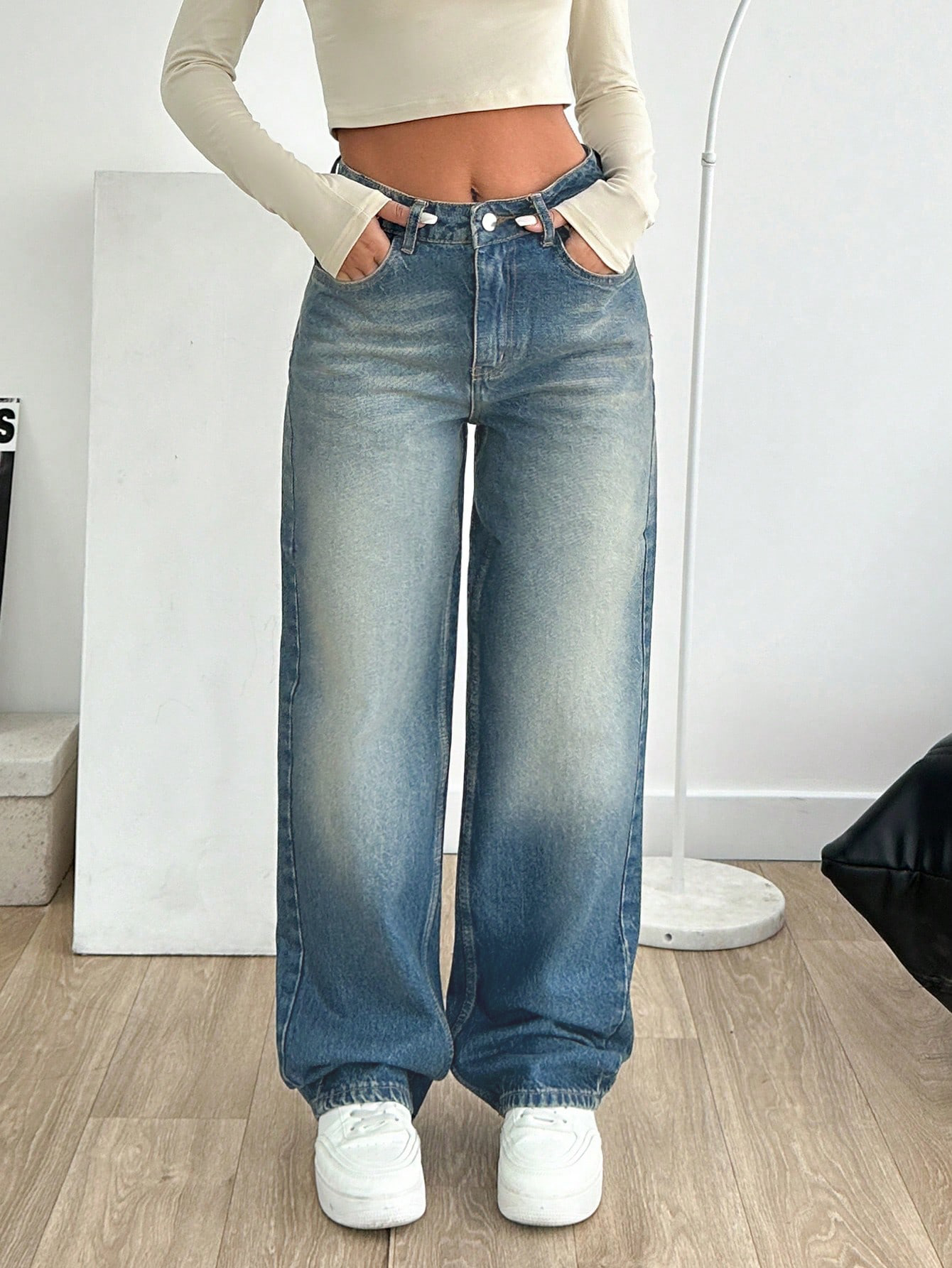 The Blue Code Straight Leg Jeans channel a vintage-inspired edge with a relaxed, easy fit. Designed in a high-rise with a straight cut, they feature a bold mid-blue base accented by faded highlights that give them a worn-in, street-ready look.