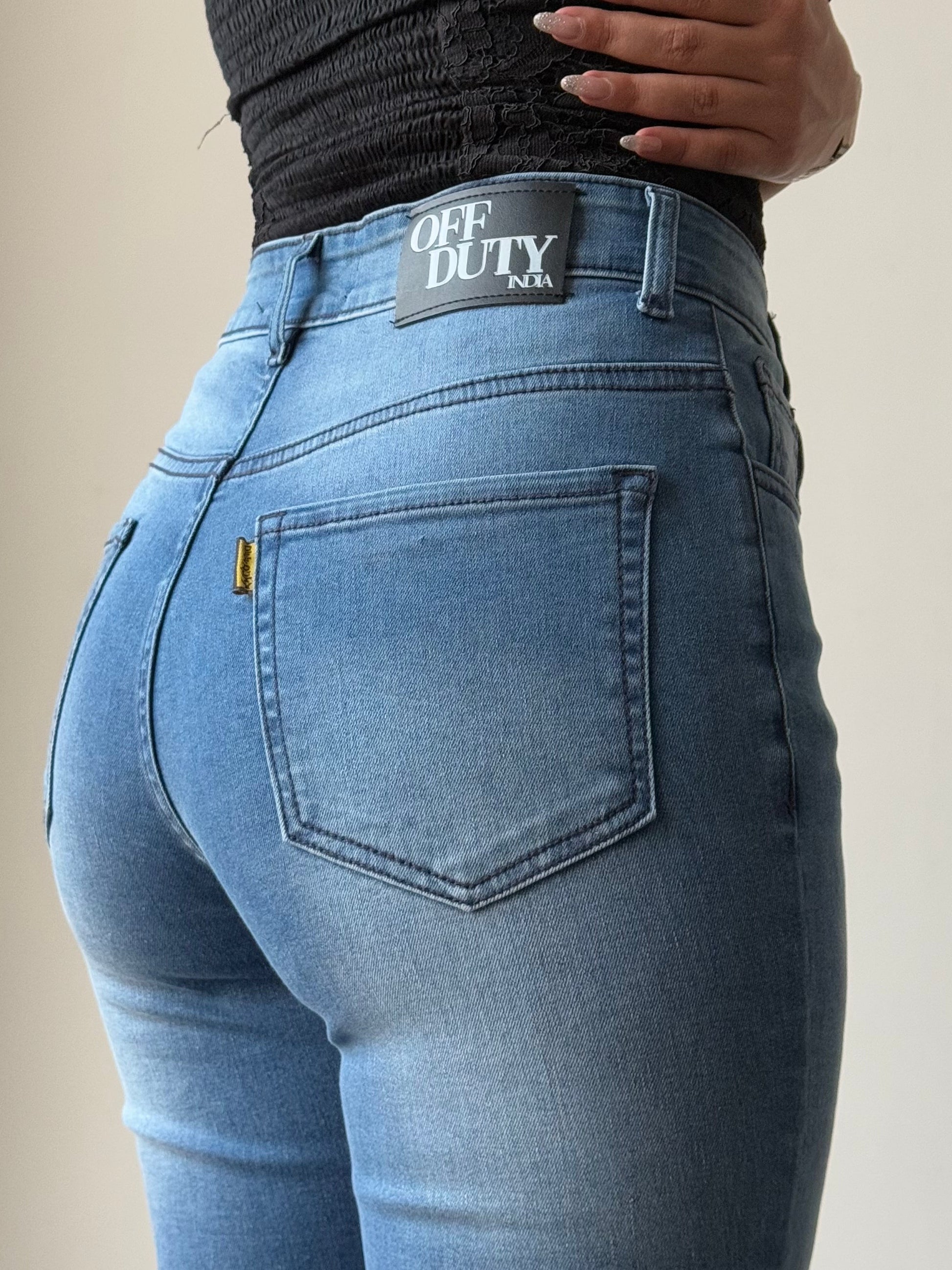 • Wash: Medium blue with soft fading at the thighs