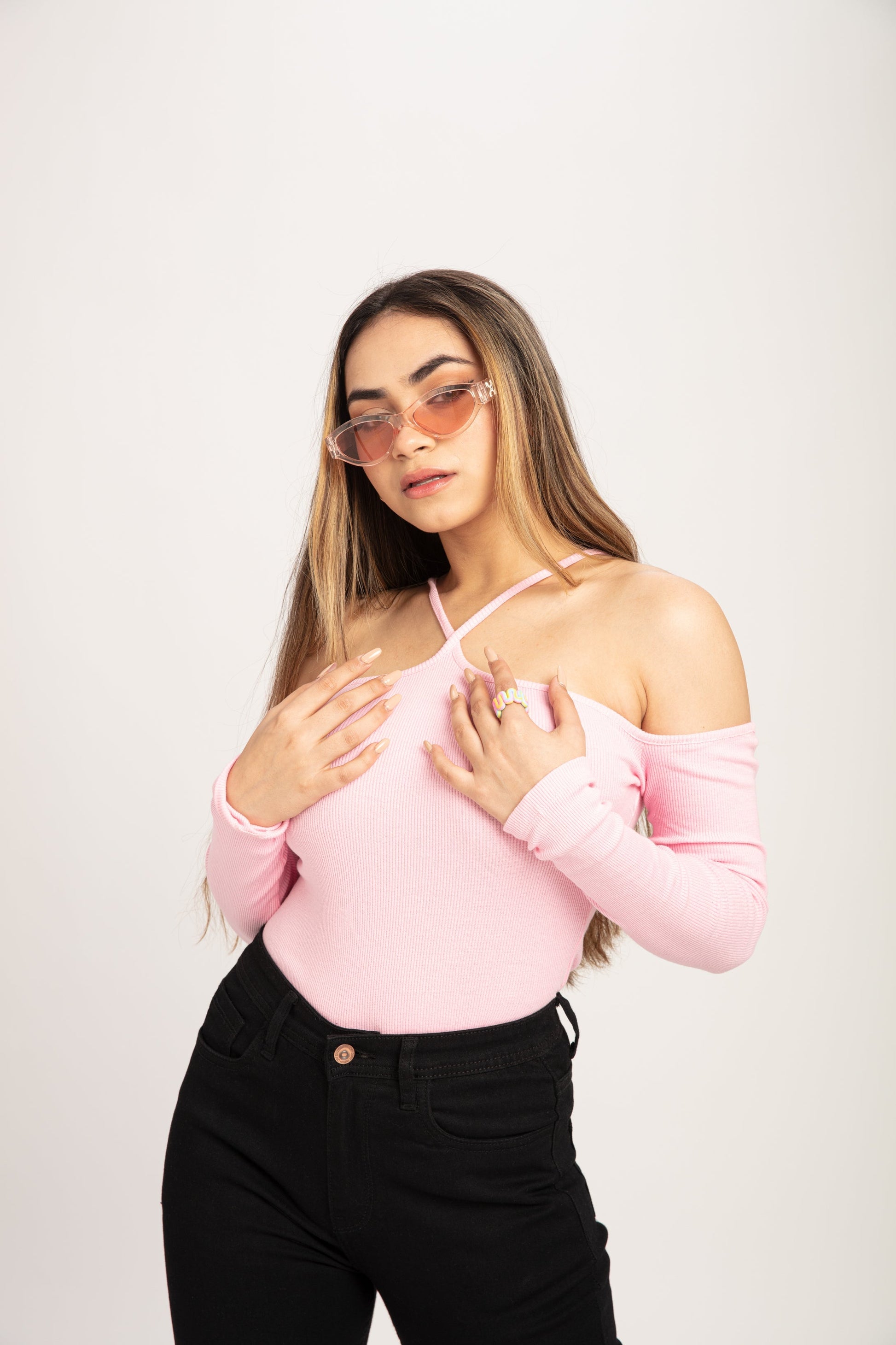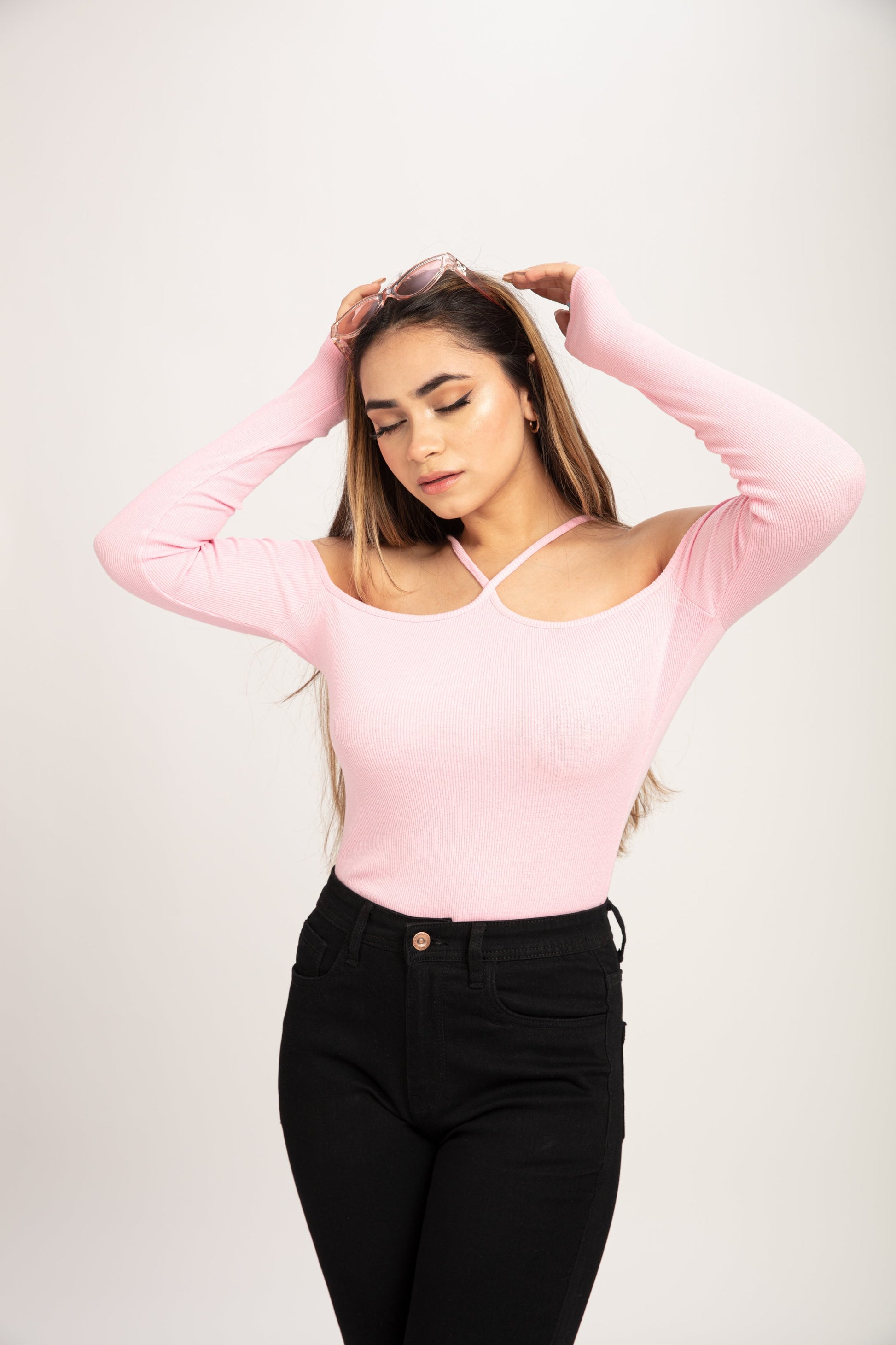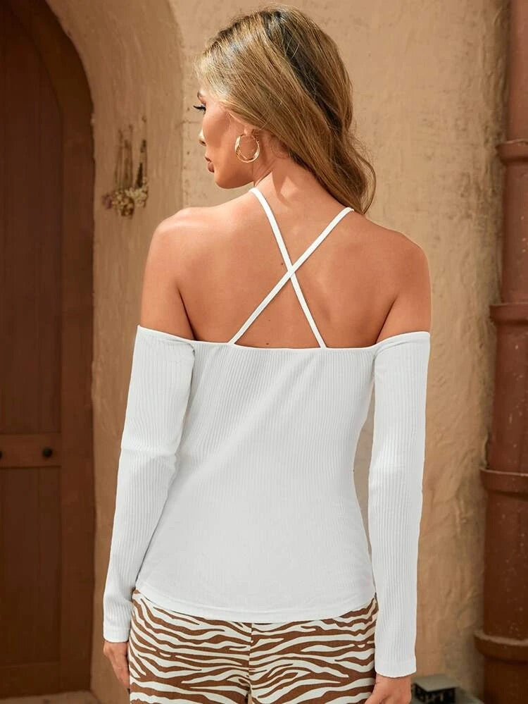 This top is sure to give your wardrobe a chic update. Featuring a white stretch rib material with a halter neck design and structured detailing, we' re in love.