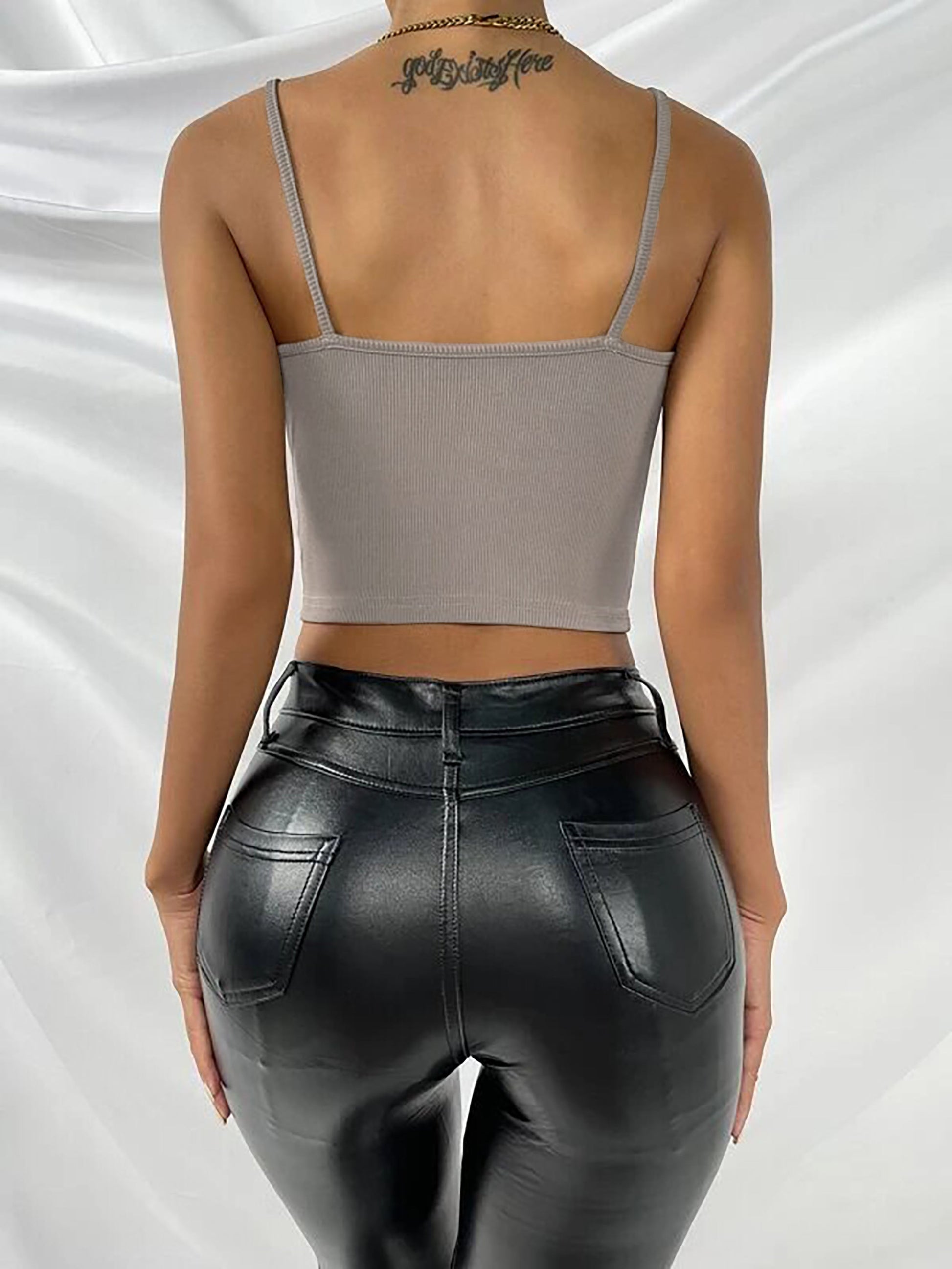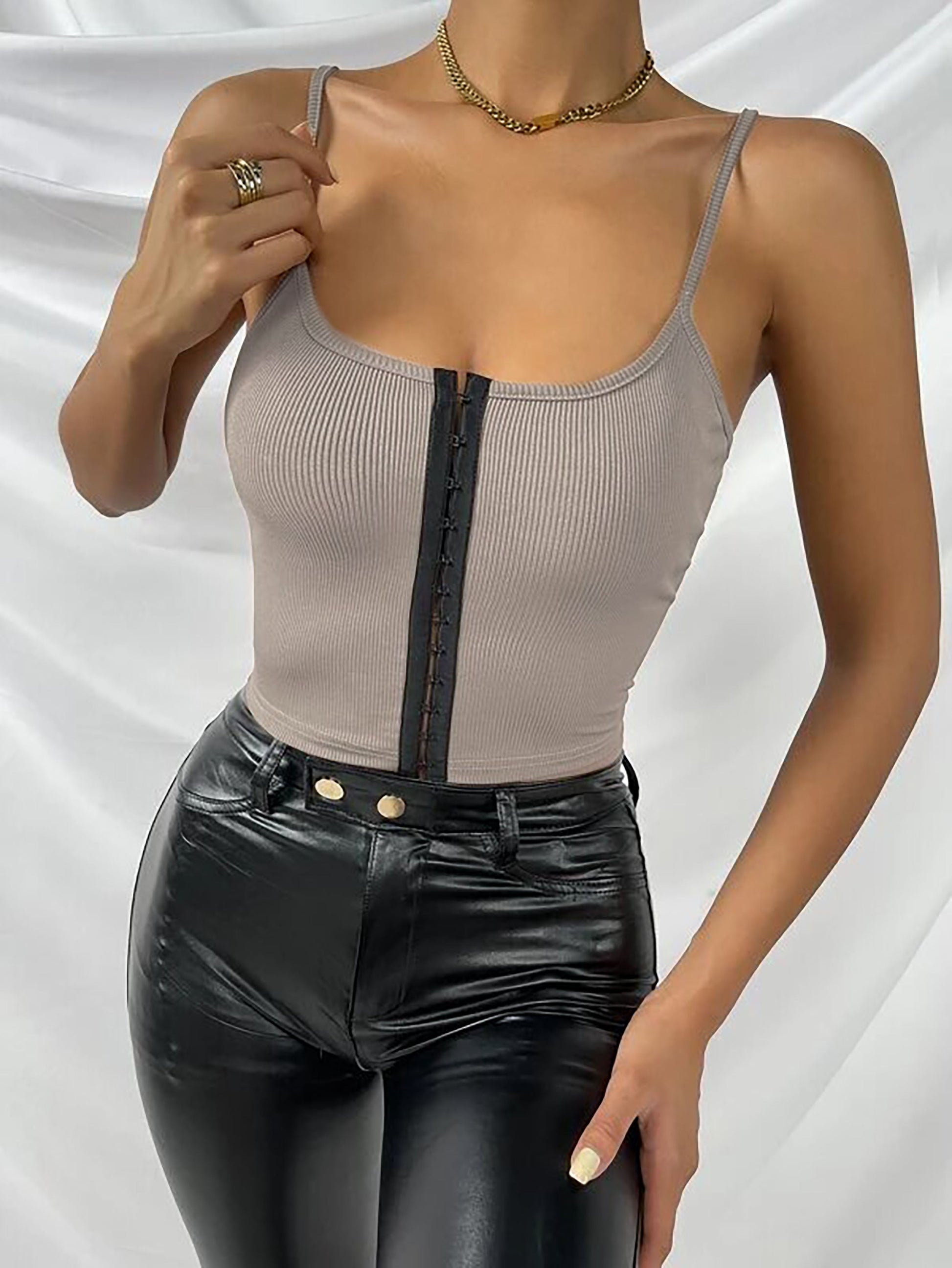 This top is sure to give your wardrobe a chic update. Featuring a grey stretch rib material with a front hook structured detailing, we' re in love.