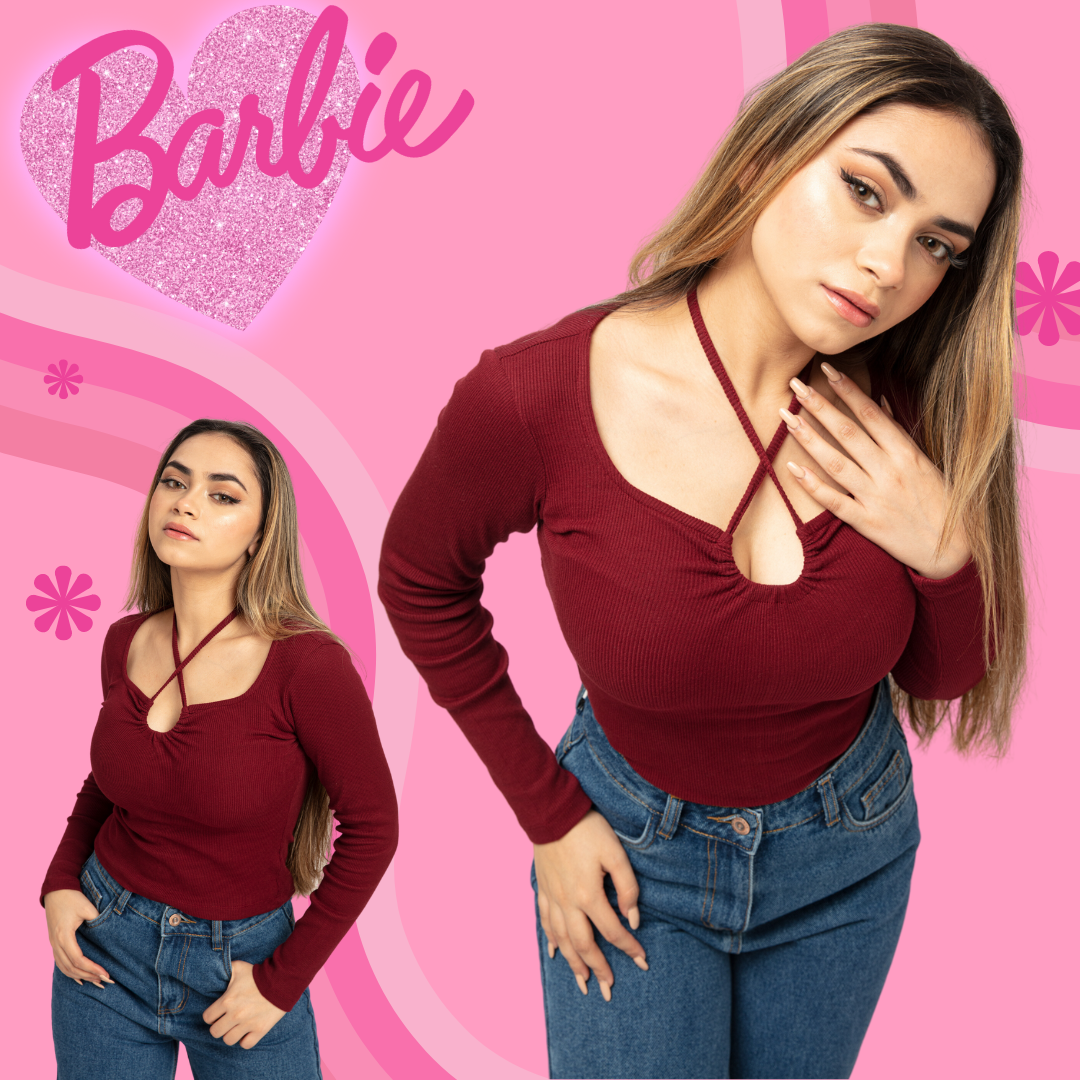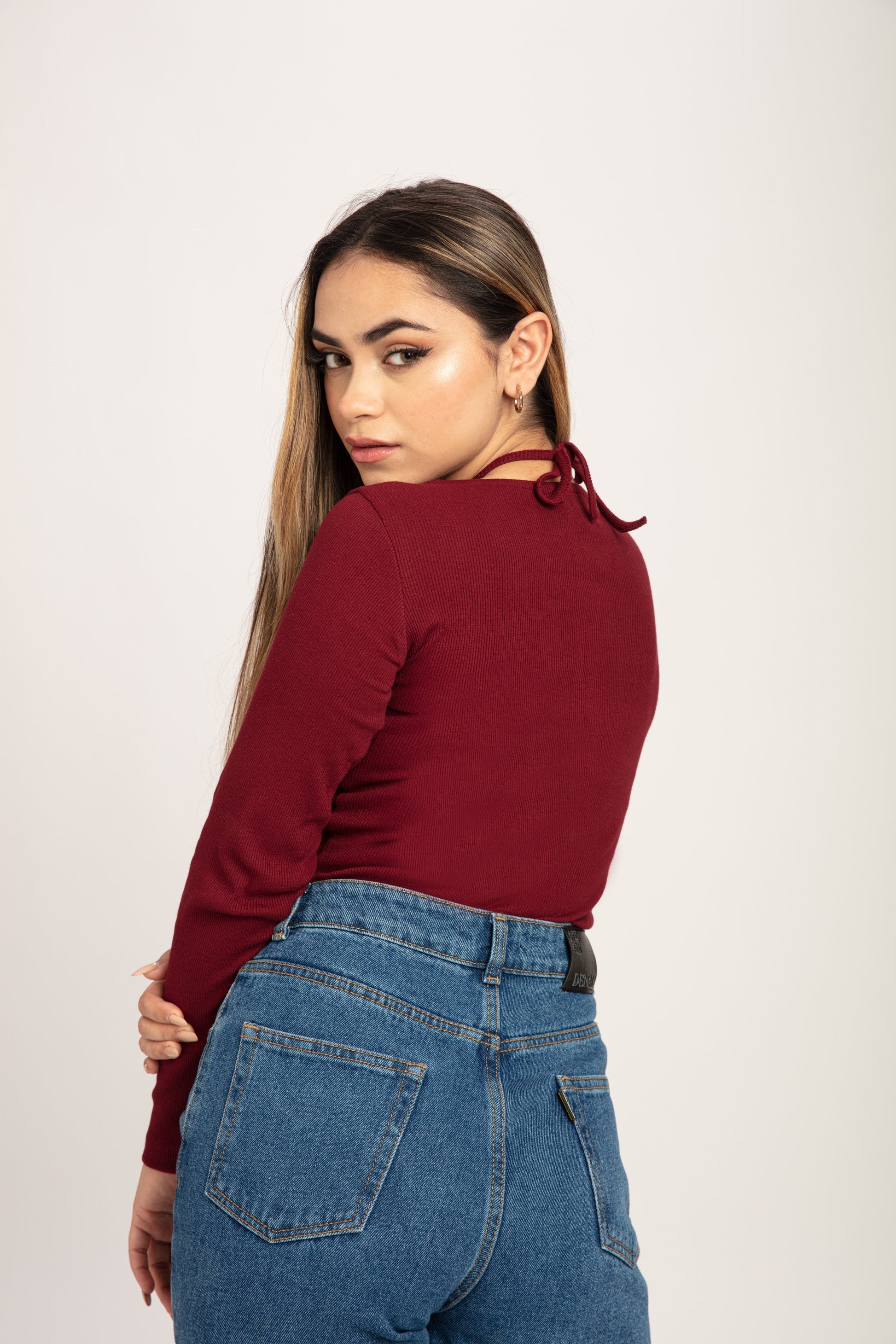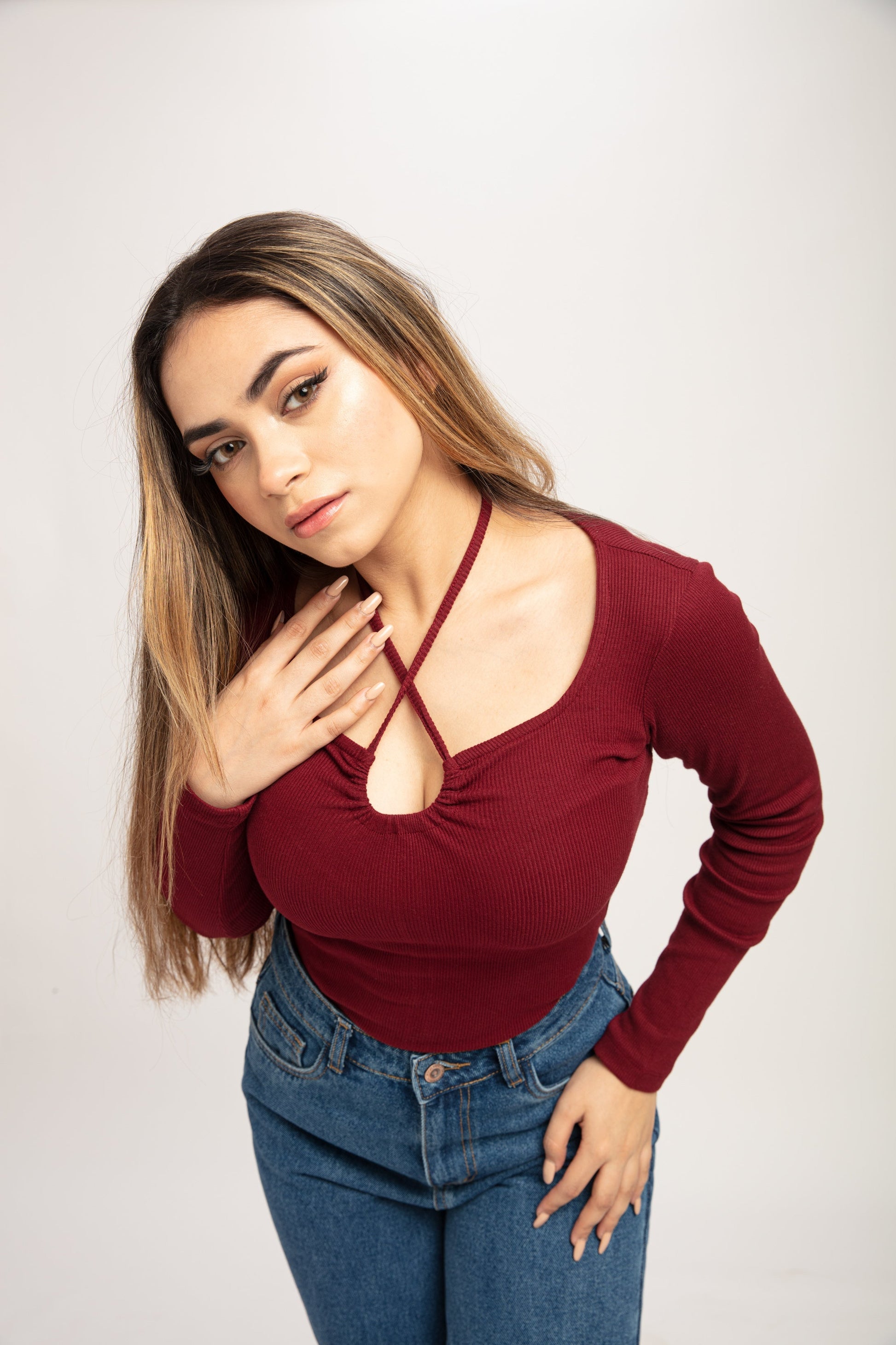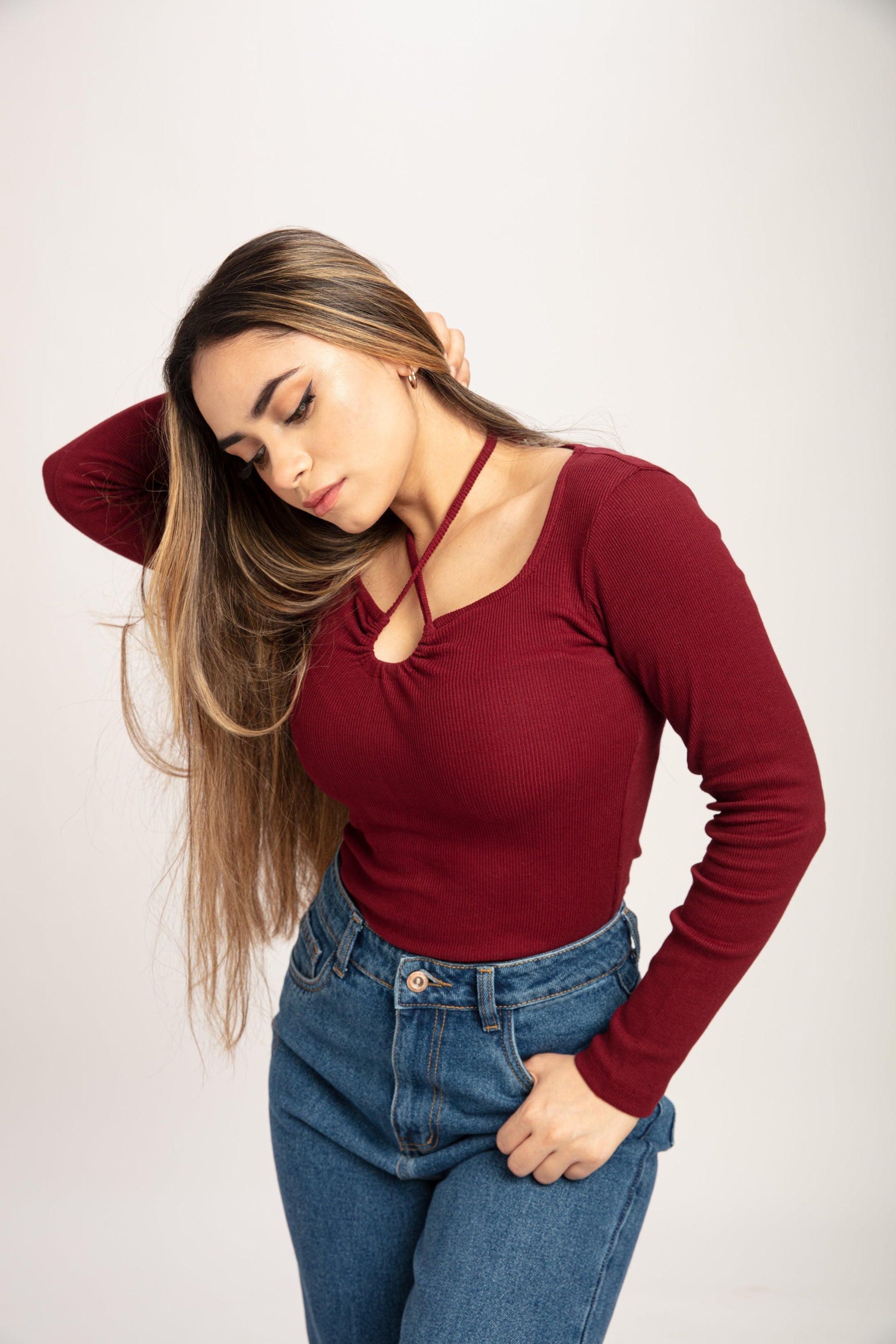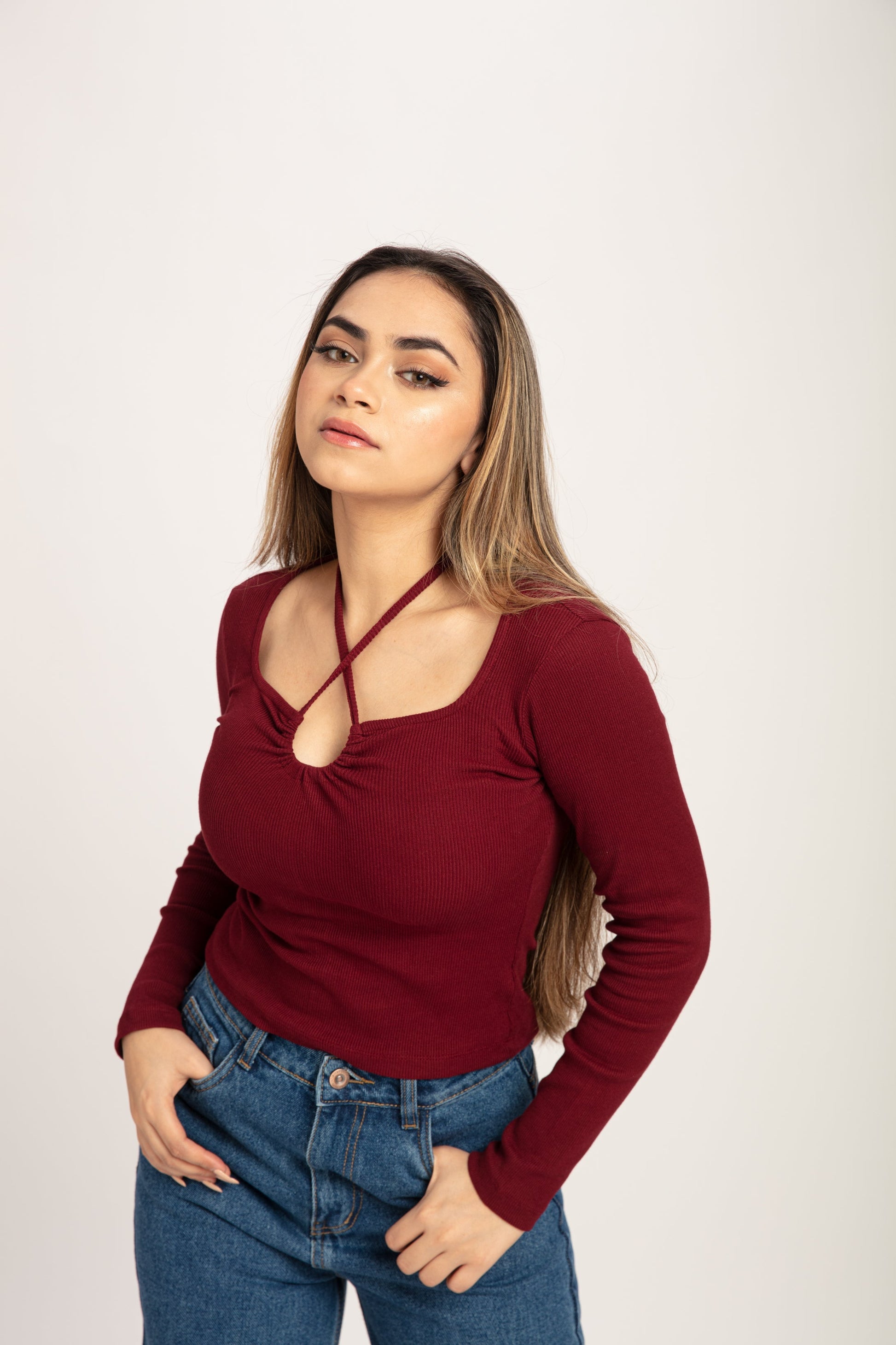 This top is perfect for your new season.Featuring a long sleeve square neck top with gathered front halter neck detail.