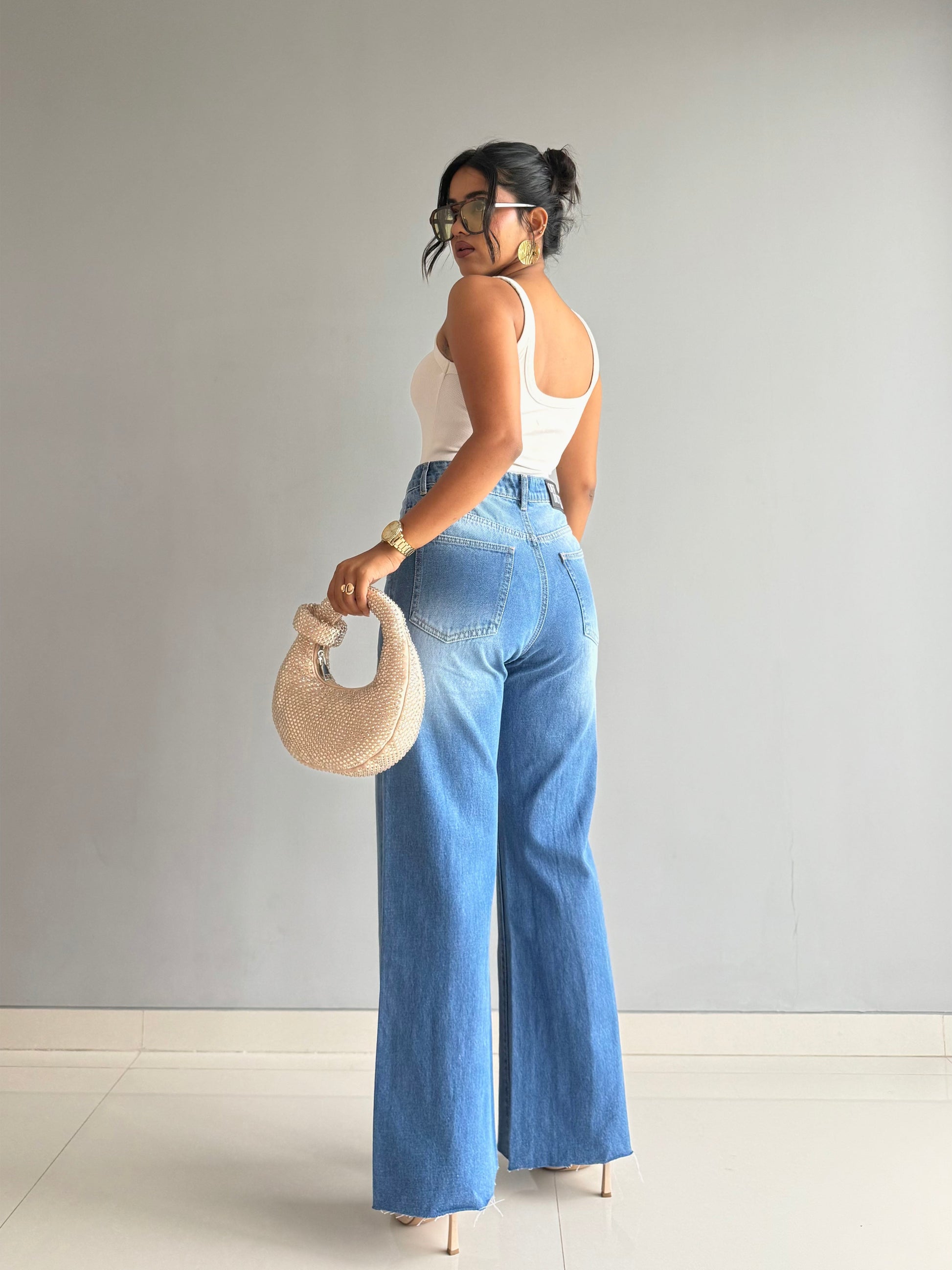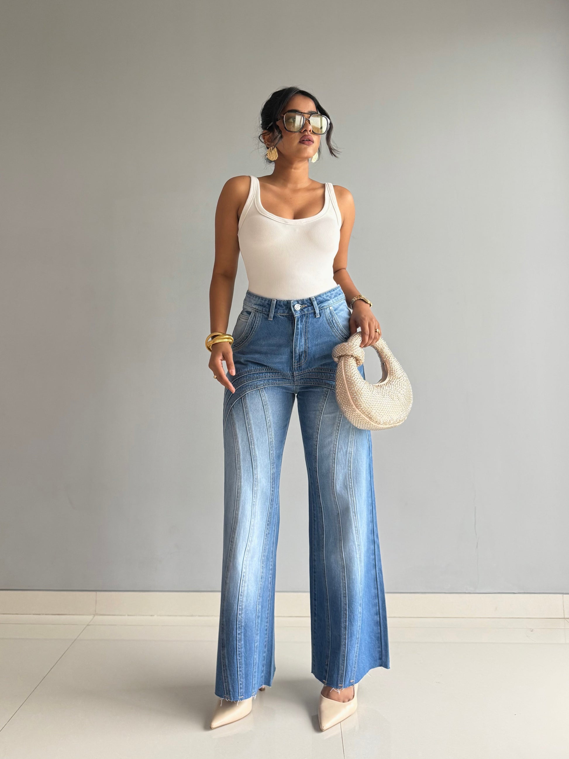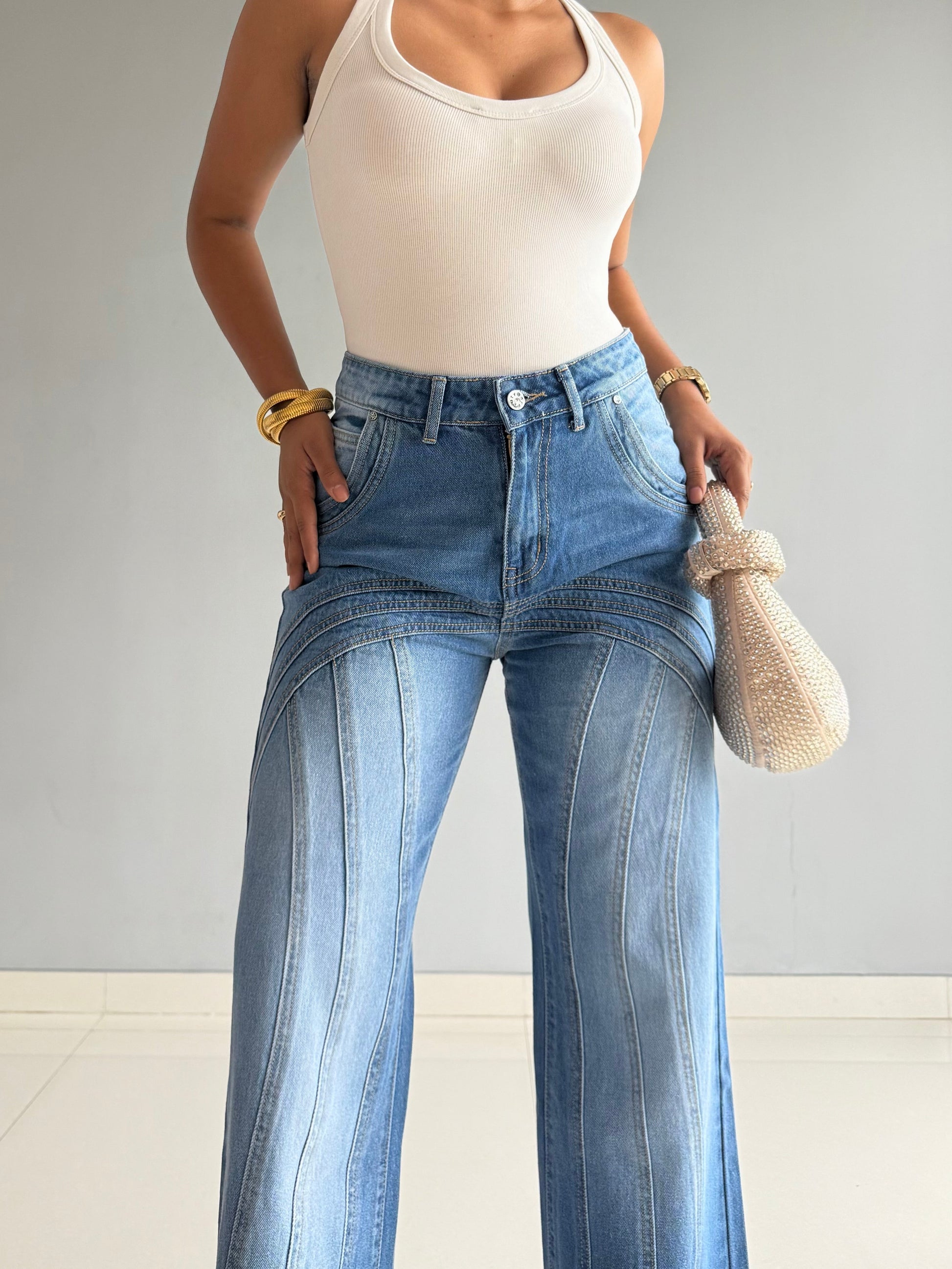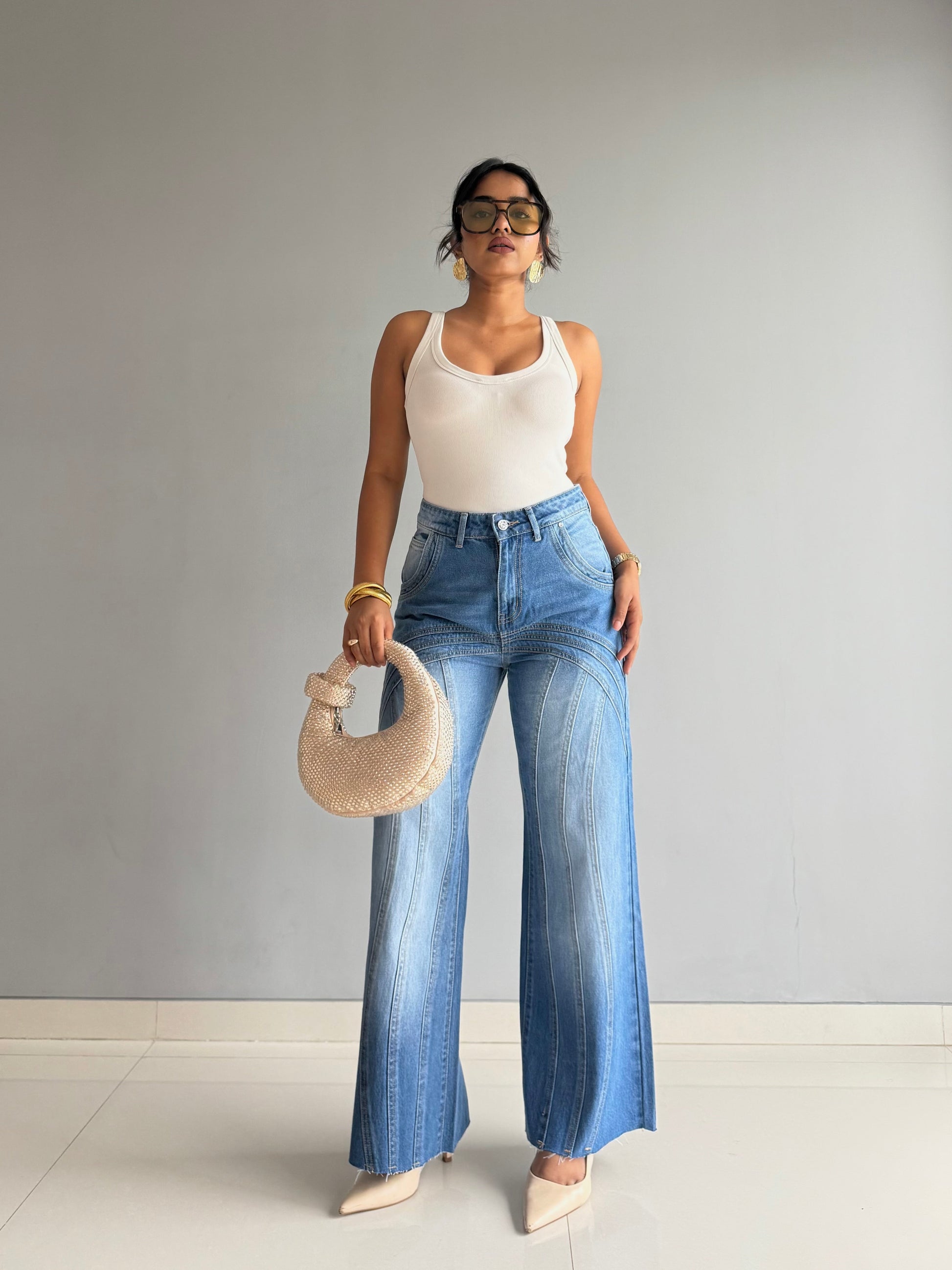 Statement Curves, Wide-Leg Flow: These Curved Panel Wide-Leg Jeans redefine street style with bold detailing and an oversized silhouette.