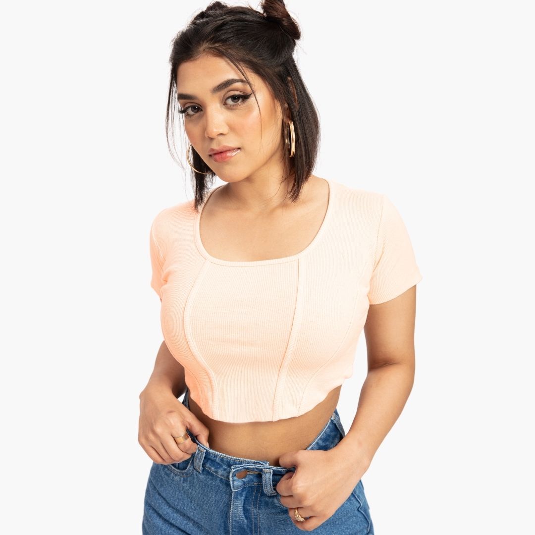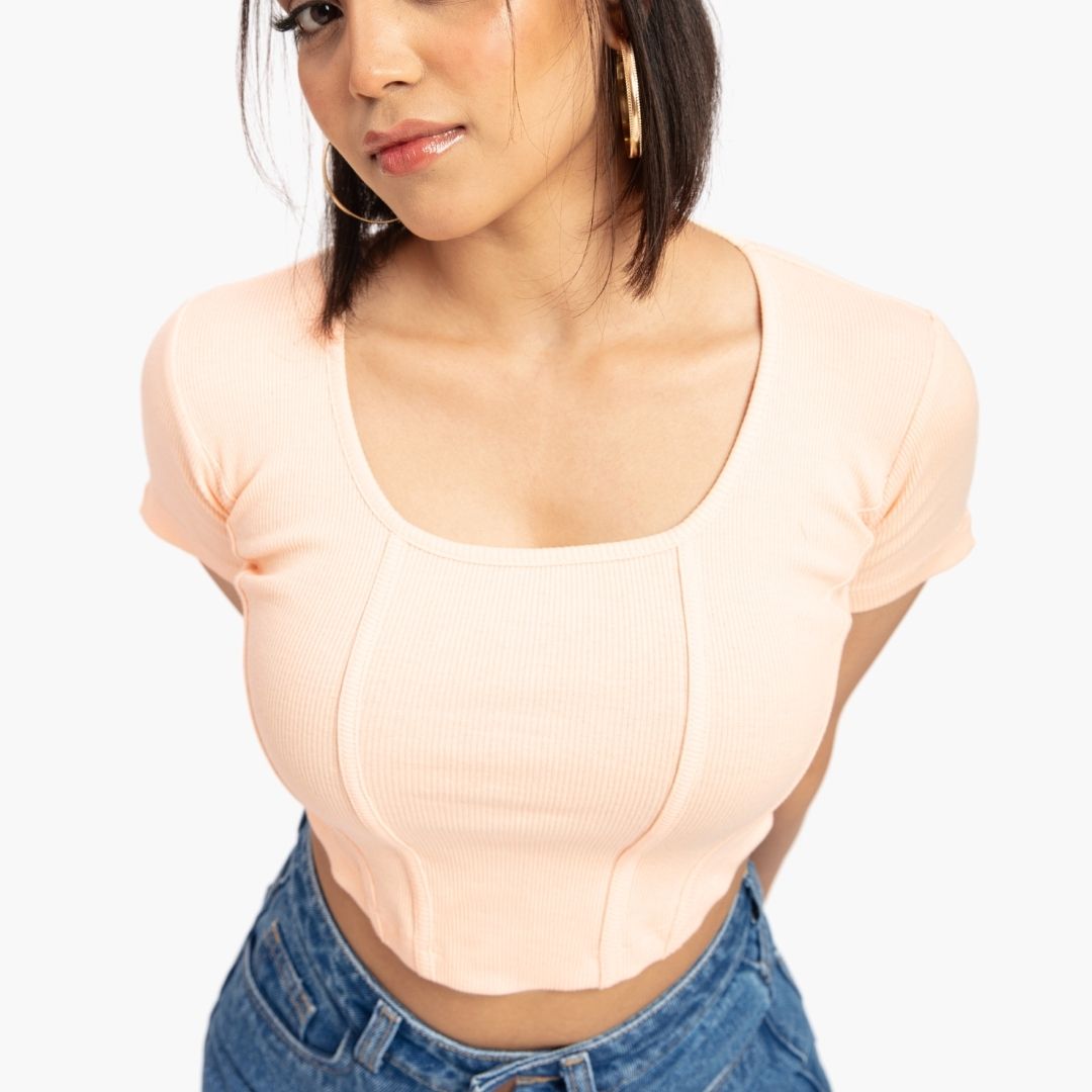 About Me :This corset features with a round neckline, short sleeves and curve hem detail.