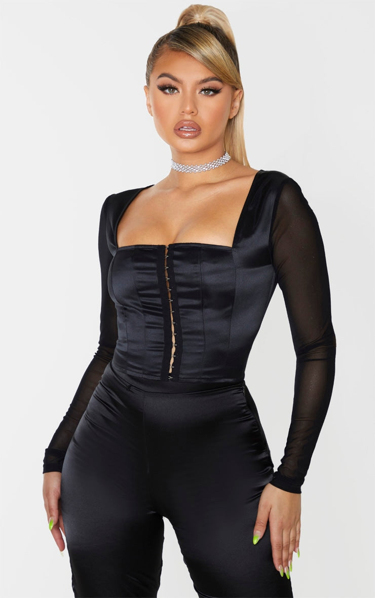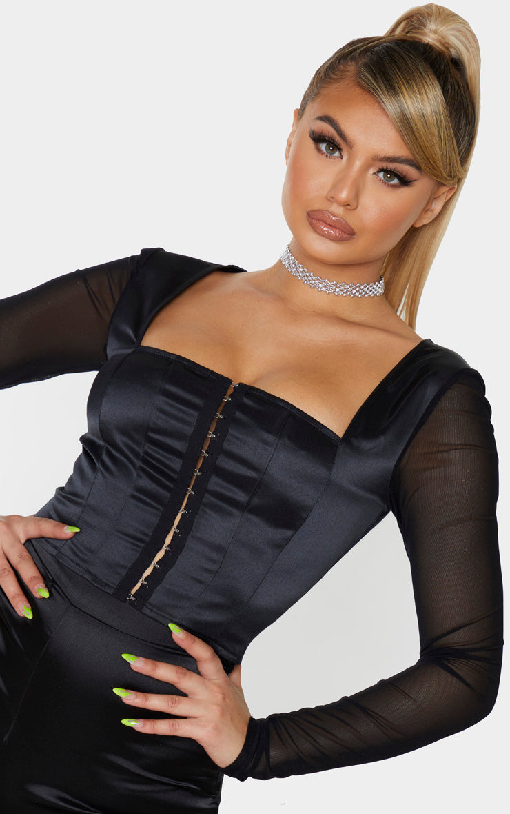 This Satin top is perfect for a date night with your girls on a weekend. Featuring a square neck Satin crop top with mesh full sleeves & hook eye detail in front.