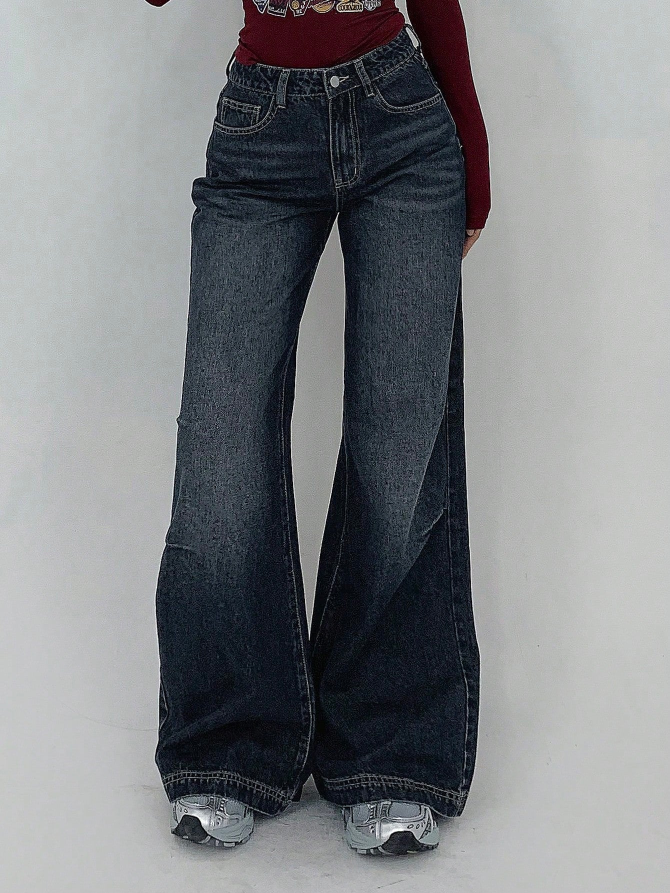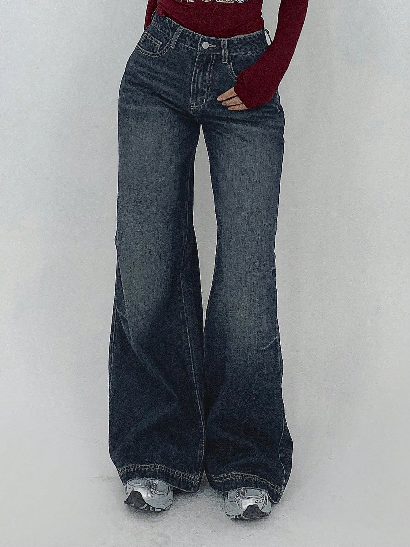 A modern nod to retro silhouettes. These flare fit jeans come in a static faded blue black wash that adds edge and dimension to the look. The high-rise waist balances the elongated flare leg, giving you a lengthened shape with a dramatic finish at the hem. Crafted in rigid 100% cotton denim, they bring that authentic vintage feel — structured yet easy to wear. Perfect with chunky sneakers for street style or heels for a sharp evening edge.