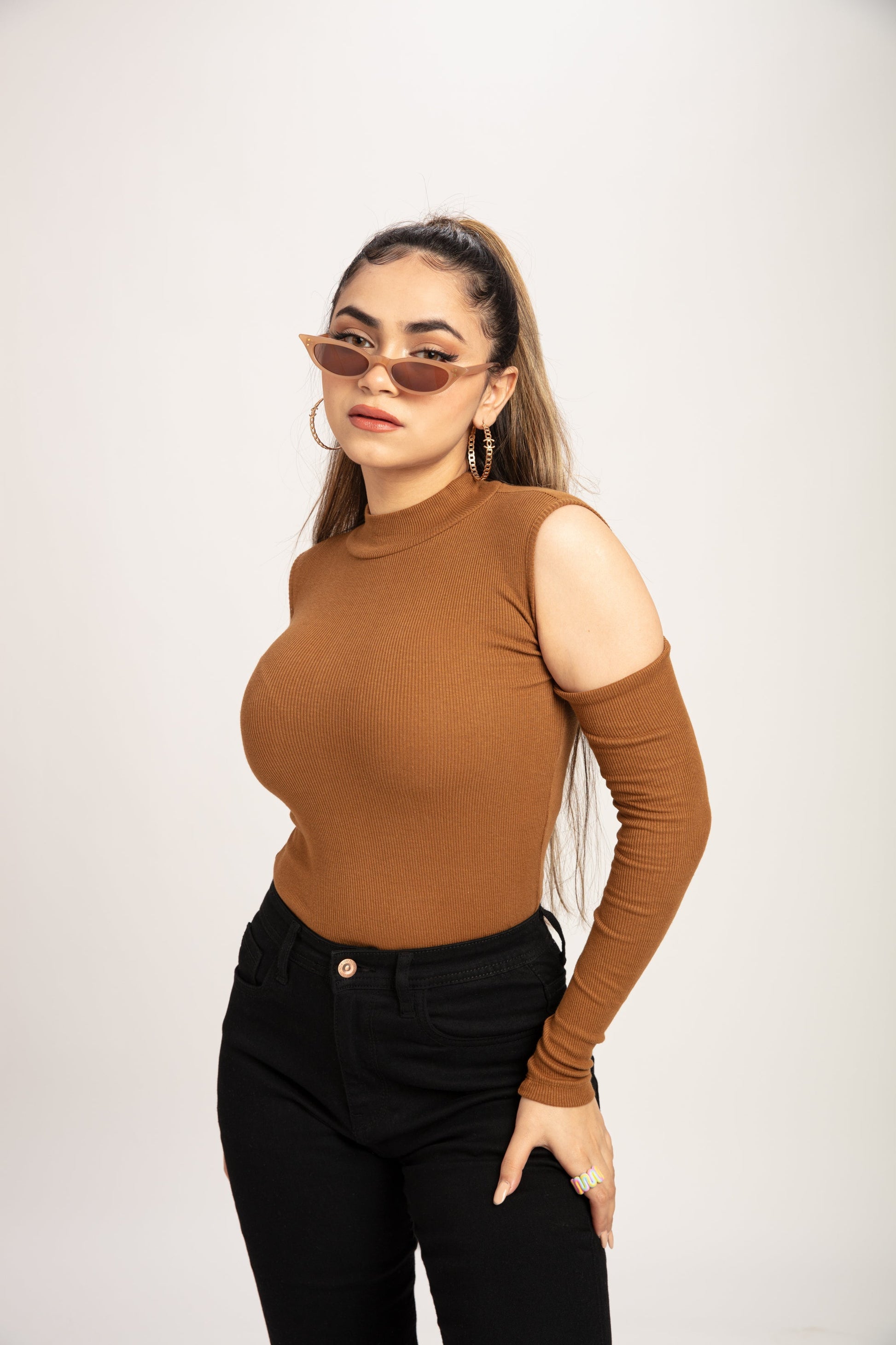 Take your new season wardrobe to the next level with this must-have top. Featuring a brown ribbed material with a high neck design and a cold shoulder style