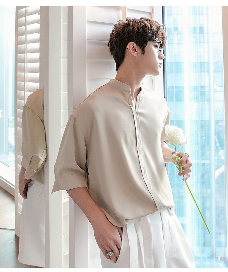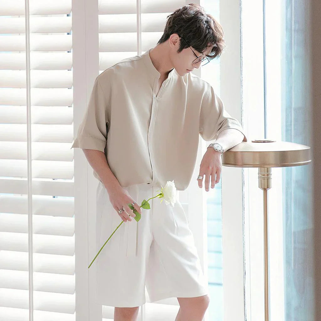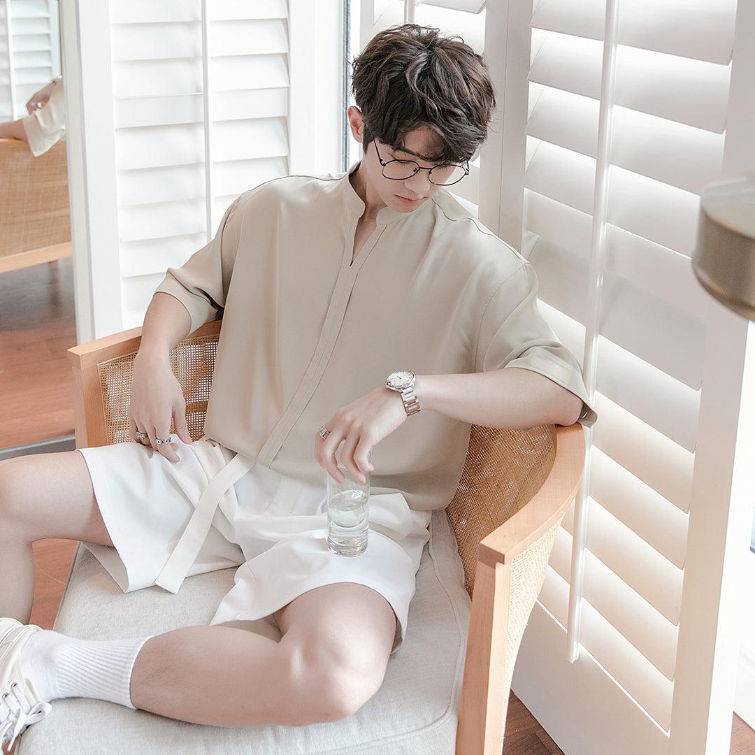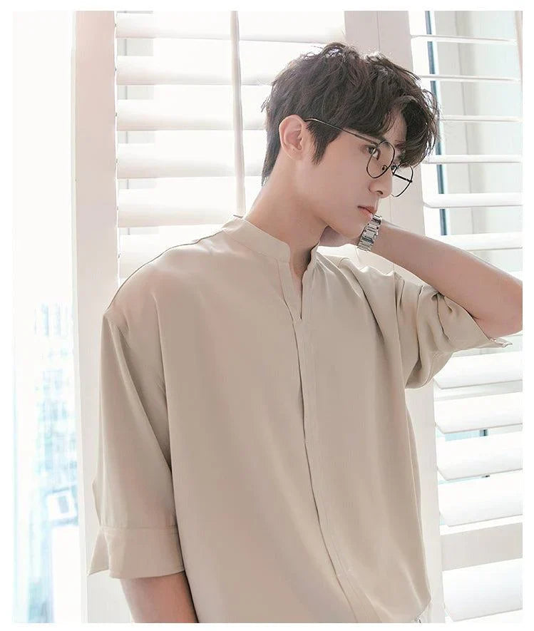 This half shirt features a Korean style with a V neck, nude color, and baggy fit for a casual yet chic look. The placket detail offers a classy touch to any ensemble. Embrace your inner fashionista with this stylish and versatile top.